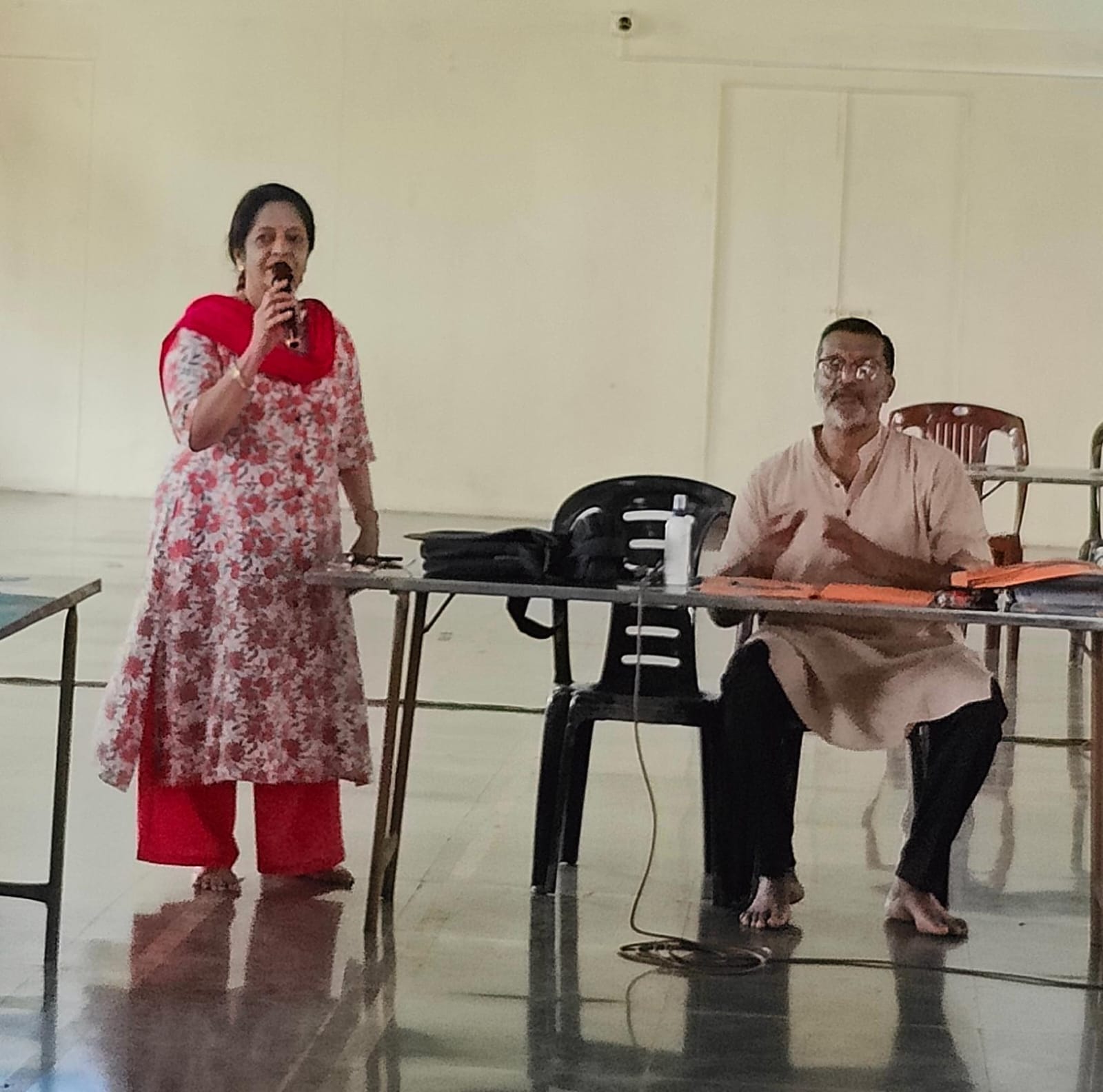 In the large hall above the bhojanashālā, after the Sabhā Prārambha Prārthanā and a brief introduction to Dr. Gaurīsh Paḍukoṇe by Smt. Chetanā Praveeṇ Kaḍl̃e, it was over to Gaurīsh mām.