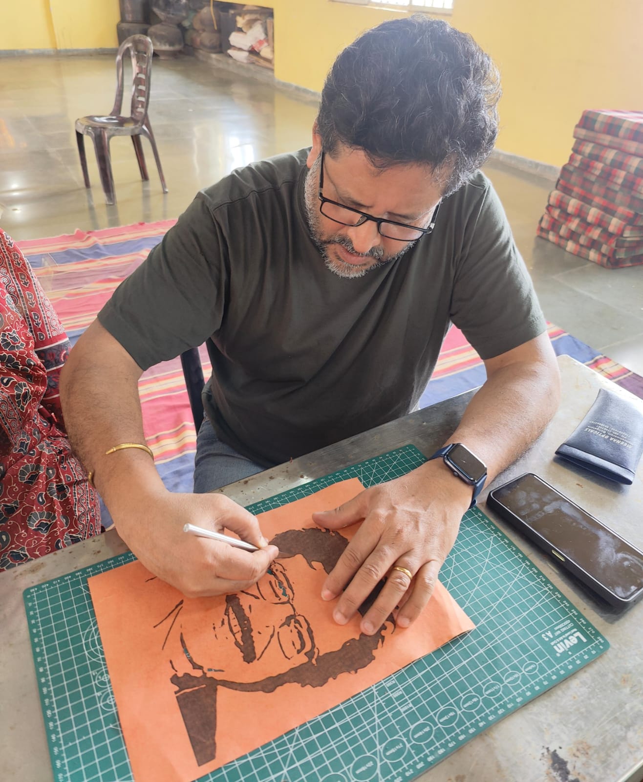 A deep spiritual longing and love for his roots and nature led Dr. Gaurīsh Rāmmohan Paḍukoṇe, a prolific clinical veterinary practitioner with a flourishing practice in Mumbaī, to relocate with his family to Koḍsul, a tiny hamlet in a remote village in Karnāṭaka, in June 1992. Gradually, over time, the silent artist in him developed a skill that allowed him to softly sketch portraits, quietly cut fine pieces of paper from the same portrait, gently reassemble them, transforming the portraits of Masters into masterpieces. While with a scalpel he tended to wounded animals, carefully stitching life back together, with glue he pieced paper, shaping beauty from fragments. Whether healing flesh or crafting form on a self-healing mat, his hands moved with the same steady care, guided by patience and love for what is fragile. For him, art and animal care are one - both require patience, precision, and love for what is delicate.