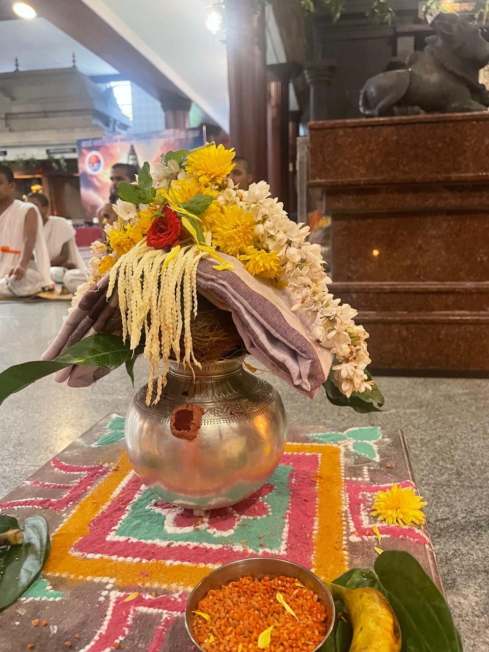 The Mahārudra Sevā at Shrī Chitrāpur Mat͟h, Shirālī begins with the auspicious Kalasha Sthāpanā on the inaugural day. This sacred installation is performed with a Prārthanā in front of the revered Hoḍi Samādhi, invoking the blessings of Lord Bhavānīshaṅkar and our Revered Guruparamparā. This is followed by a Prāyashchitta Homa.