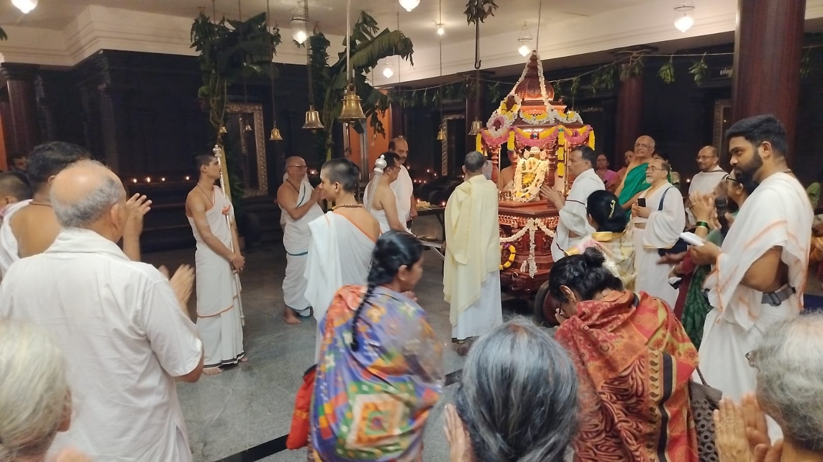 On the concluding day of the Mahārudra Sevā, a Shrī Pus͟hpa Ratha Sevā is offered. It is verily an Utsava by itself. It is centered around a Pus͟hpa Ratha which was donated during H.H. Shrīmat Sadyojāt Shaṅkarāshram Swāmījī’s S͟has͟hṭyabdapūrti celebrations and is a sacred offering of devotion to Lord Bhavānīshaṅkar. In earlier times, a Pālkī Utsava was held on the fifth day. This beautiful tradition, with the participation of the Yajamāna and his family, carries forward the spirit of sevā and surrender. The Deity is taken in the Pus͟hpa Ratha in seven rounds of the sanctified inner Parikramā—each accompanied by Vedic chants— which consist of chanting of Ṛgveda, Yajurveda, Saṅgīta, and playing of musical instruments which consist of Shaṅkha Vādya, Veṇu Vādya, Mauri Vādya, and Sarva Vādya, filling the atmosphere with divine vibrations. After the final round with Sarva Vādya sevā, the Lord is ceremonially taken back to the main shrine, after which the daily sacred As͟hṭāvadhāna Sevā begins.