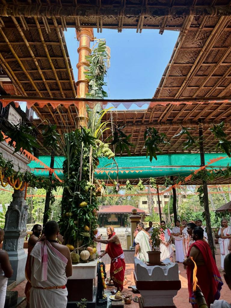 The Dhwajastambha was replaced on 26th February, 2003, under the guidance of H.H. Shrīmat Sadyojāt Shaṅkarāshram Swāmījī, with the trunk of a Vaṭāmbe tree, measuring 33 feet, 3 inches, in length. It was consecrated in the Rājāṅgaṇa. It has a bronze protective covering with a cushion of several quintals of Til, to ward off deterioration of the wood. It has an ornamental brass base and a Pañchaloha Nandī at the top, which is the Divya Chaitanya of the Stambha.