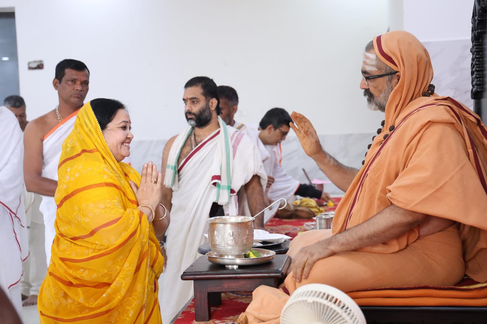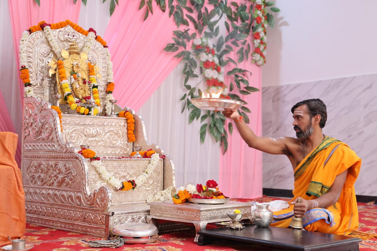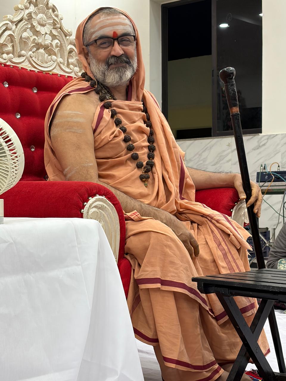 On the night of 16th December 2025, the air at Sāraswat Bhavan was charged with joy, devotion, and anticipation as devotees awaited the divine darshana of H.H. Shrīmat Sadyojāt Shaṅkarāshram Swāmījī. Ladies adorned in elegant sārī-s stood gracefully holding Pūrṇa Kumbha-s, their faces glowing with reverence.