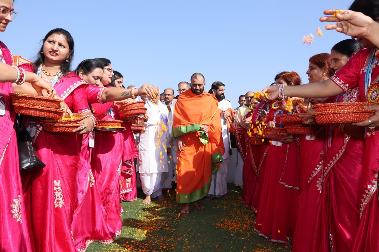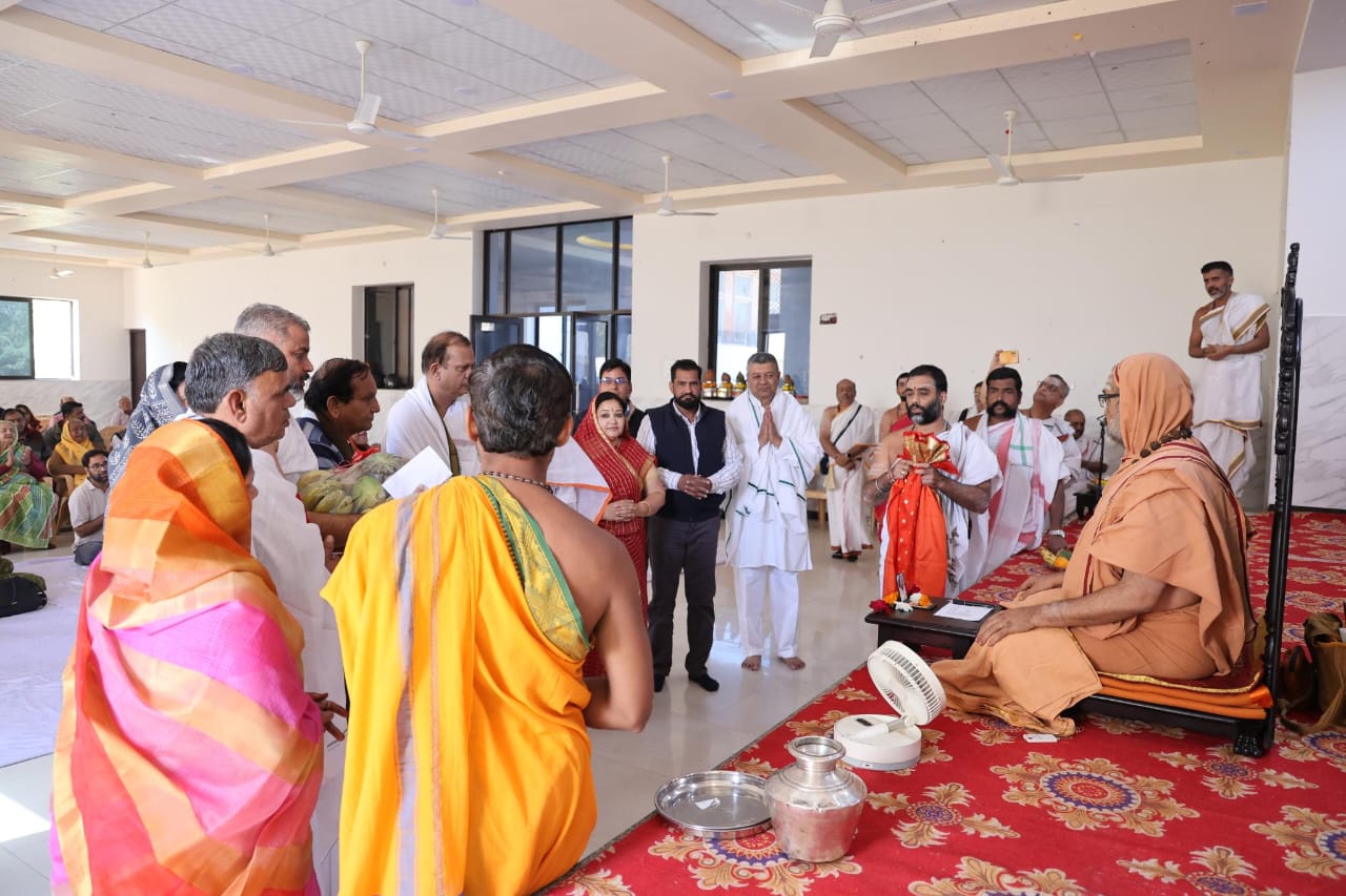 The moment H.H. Swāmījī arrived in His Shivarañjanī, the atmosphere was filled with divinity, excitement and heartfelt devotion. Welcomed with Pādapraks͟hālana by Shrī R.K. Ojhā Jī, H.H. Swāmījī walked inside, blessing all with His compassionate presence, as devotees showered flowers at the Lotus Feet of their Guru.