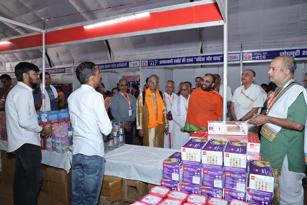 H.H. Shrīmat Sadyojāt Shaṅkarāshram Swāmījī also visited the exhibition at the Sammelana, which offered a vibrant glimpse into the enterprise and creativity of the Sāraswata community. Stalls represented a wide range of sectors, including automobiles, Ᾱyurveda and wellness, robotics and automation, textiles and yarns, education, real estate, minerals, home solutions, handicrafts, food, jewellery, and women-led initiatives.