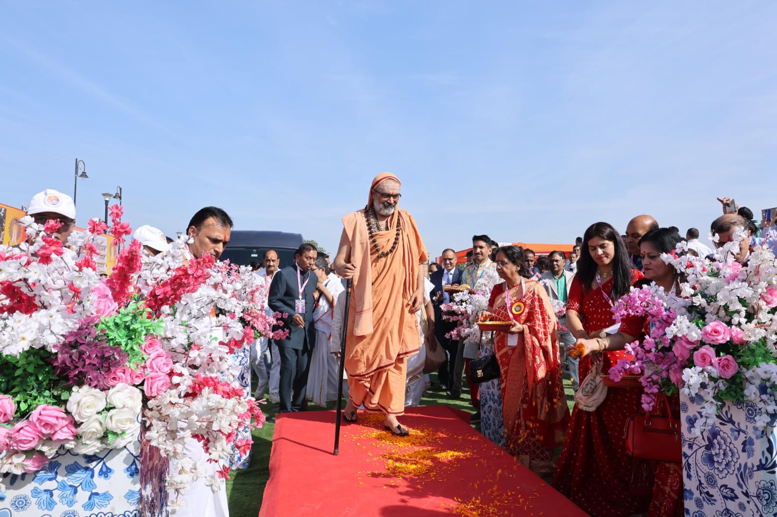 The arrival of H.H. Shrīmath Saṁyamīndra Tīrtha Swāmījī marked a moment of divinity and grandeur. Pujya Swāmījī was welcomed with Pūrṇa Kumbha. In His Ᾱshīrvachana, H.H. Shrīmath Saṁyamīndra Tīrtha Swāmījī addressed the gathering saying that all Sāraswata-s, spanning from Kashmīr to Kanyākumārī, are the children of Mā Saraswatī, bound not only by geography but by shared values. His emphasis on unity, Gāyatrī Upāsanā, and Sandhyāvandanam resonated deeply with the audience.