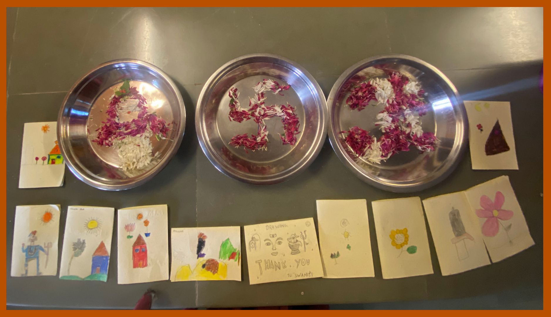 The children whole-heartedly enjoyed the snacks which were served at the end of the session. The cheese sandwiches were sponsored by Tanvī pāchī and made by all the Prārthanā Varga teachers. The ‘Gems’ packets were sponsored by Divyā Shirālī pāchī. Beenā Savkūr pāchī sponsored the cupcakes, ‘Oreo’ biscuits, ‘Cadbury chocolates’, ‘Frooti’ mango drink and flowers for the floral activities.