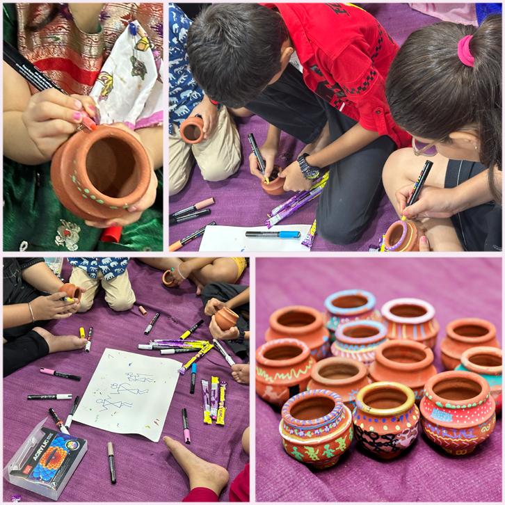 This was followed by a craft activity conducted by Jānhavī Mallāpur where children, parents and volunteers enthusiastically participated in the pot painting activity using acrylic paint pens. Jānhavī also taught the participants to draw Wārlī art figures on the pots. While the kids enjoyed the activity, for the seniors getting back to painting after ages made them feel very nostalgic. Each pot was beautifully painted displaying different expressions of art.
