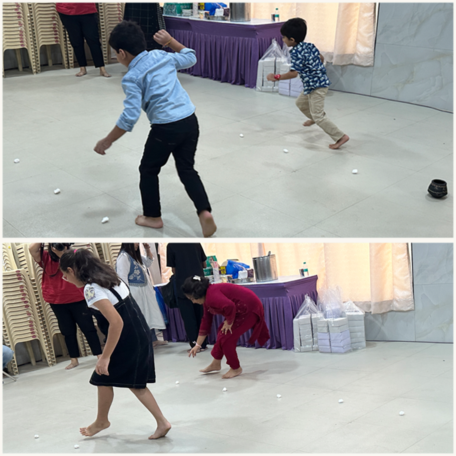 The next session was the Mākhana Chora race, a game planned by Chaitanya Mallāpur, to re-energize the kids. The children had to race and collect the cotton balls (symbolising butter or ‘Mākhana’) and put them in the pot at the end of the row. The child who managed to pick up all the Mākhana balls before the other one, won the race. It was a great energy booster as every Mākhana Chora was cheered to win the race, charging up the environment and encouraging the little ones.