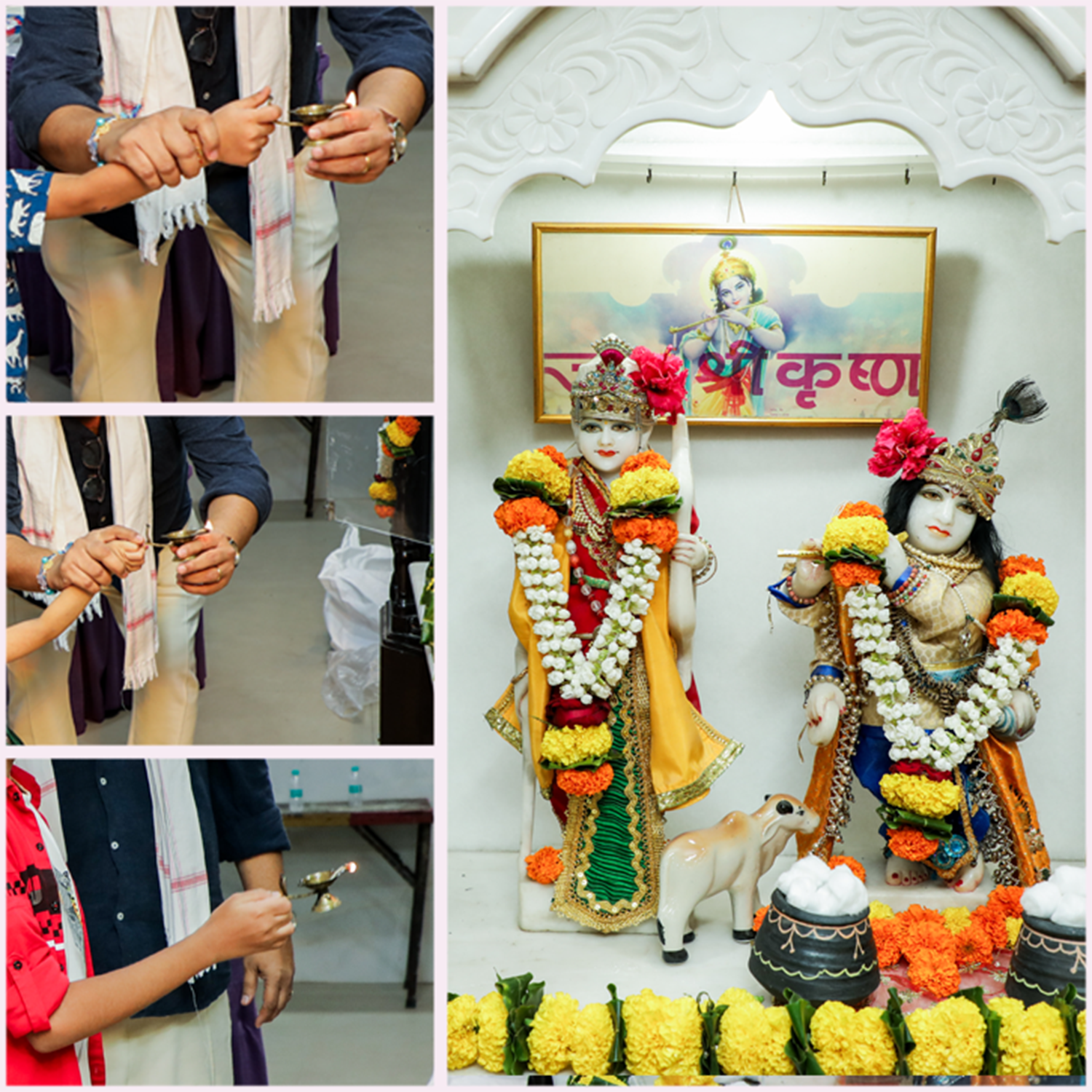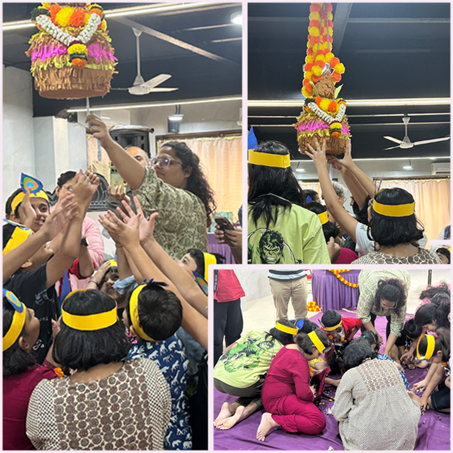 On the morning of August 10th, the hall was beautifully decorated with traditional ‘Kel ī Khāmba’ and marigold toraṇa at the entrance, giving an aesthetic vibe to the venue. A Haṇḍī (clay pot) hung at the entrance to welcome our Bāla Gopāla-s and Gopikā-s.
