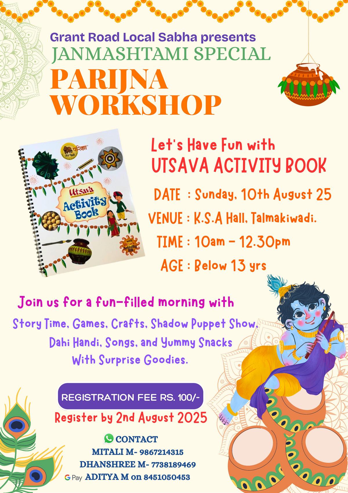 A creative poster was designed by Dhanshree Mallāpur and Mitālī Mallāpur for the workshop depicting Bāla Gopāla sitting with his flute and Mākhana pots. The poster also featured the Utsava Activity Book from the Parijñā series based on which some of the activities for the workshop were selected.