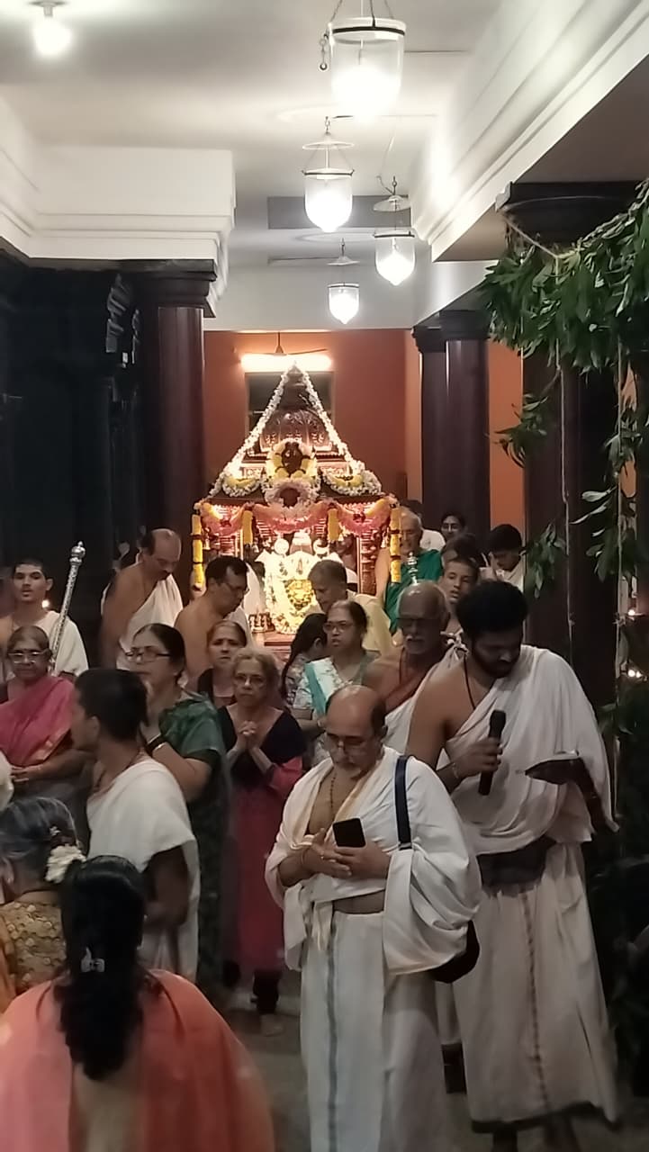 On the concluding day of the Mahārudra Sevā, a Shrī Pus͟hpa Ratha Sevā is offered. It is verily an Utsava by itself. It is centered around a Pus͟hpa Ratha which was donated during H.H. Shrīmat Sadyojāt Shaṅkarāshram Swāmījī’s S͟has͟hṭyabdapūrti celebrations and is a sacred offering of devotion to Lord Bhavānīshaṅkar. In earlier times, a Pālkī Utsava was held on the fifth day. This beautiful tradition, with the participation of the Yajamāna and his family, carries forward the spirit of sevā and surrender. The Deity is taken in the Pus͟hpa Ratha in seven rounds of the sanctified inner Parikramā—each accompanied by Vedic chants— which consist of chanting of Ṛgveda, Yajurveda, Saṅgīta, and playing of musical instruments which consist of Shaṅkha Vādya, Veṇu Vādya, Mauri Vādya, and Sarva Vādya, filling the atmosphere with divine vibrations. After the final round with Sarva Vādya sevā, the Lord is ceremonially taken back to the main shrine, after which the daily sacred As͟hṭāvadhāna Sevā begins.