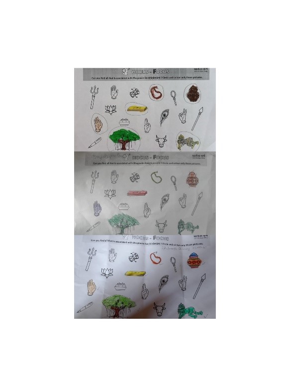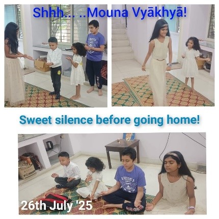 This year for Chaturmasa, each child has taken his/her own simple sankalpa-s for every week like- I will finish whatever is served in my plate, or I will keep my bag and shoes in place after coming back from school and more... Each child has been given a sankalpa sheet in the form of a calendar on which they mark everyday with a tick after completing the sankalpa for that day. Further, each class has taken a Varga-sankalpa to chant Deepanamaskara in every session. That is also marked in the sankalpa sheet. Children get diya points on their sankalpa sheet from their teachers on honestly completing their sankalpa in that week!