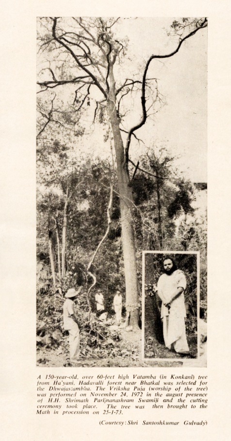 The Rathotsava at Shirālī was put on hold for about 34 years and reinstated in 1973 by H.H. Shrīmat Parijñānāshram Swāmījī III. By this time, the Koḍī Khāmbŏ (Dhwajastambha) was in a dilapidated state and needed replacement. The new Stambha was installed in the middle hall i.e. the earlier portico (opposite the present Devī Bhuvaneshwarī Sannidhi) with Āgamokta Vidhi-s in the august presence of H.H. Shrīmat Parijñānāshram Swāmījī. It would later be copper plated and placed in a permanent pīt͟ha adorned with a bronze Nandī at the shikhara.