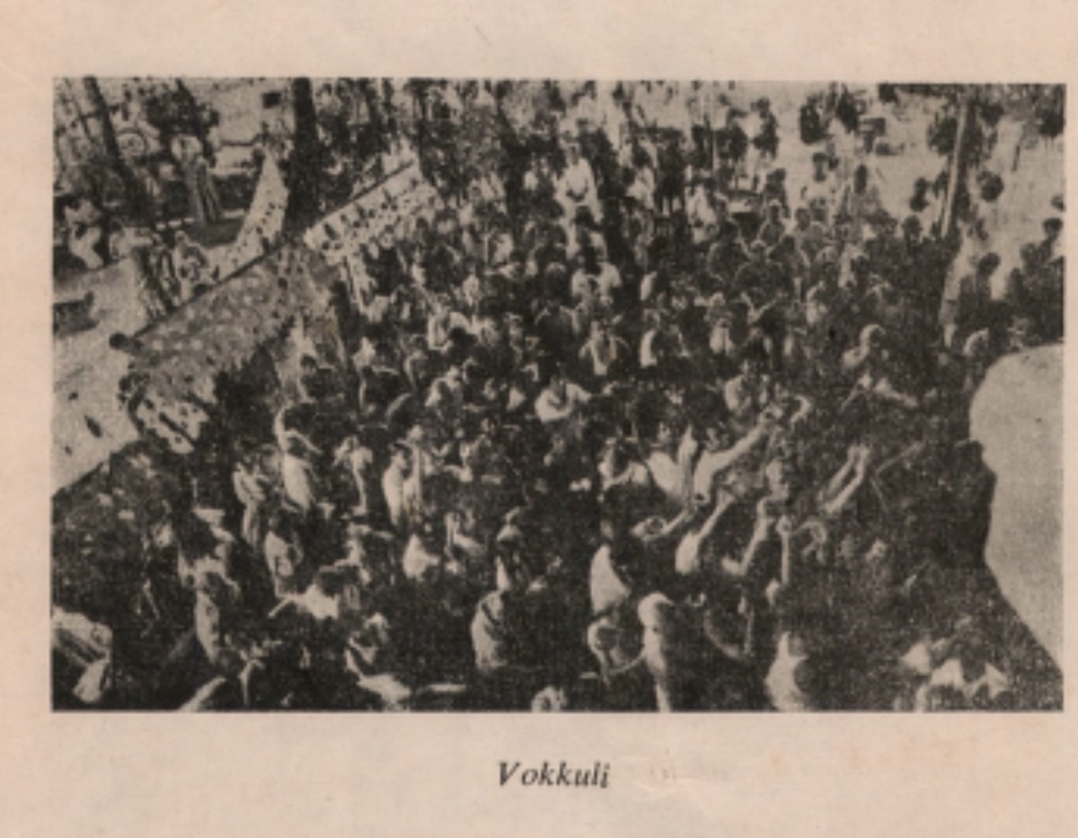 The Rathotsava at Shrī Chitrāpur Mat͟h, Shirālī commences with Dhwajārohaṇa. It is concluded with Dhwajāvarohaṇa after the Avabhṛtotsava (purificatory bath), followed by Mahāpūjā, Maṅgalāratī, Sāmūhika Prārthanā, Aṅkur Prasāda Vitaraṇa. It is recommended that the devotees who attend the Rathotsava from Koḍī, participate in the Avabhṛta snāna (Vokkul̃ī or Okkul̃ī). The area around the Dhwajastambha is full of verve and colour as sādhaka-s gustily participate in Vokkul̃ī. Coloured water is liberally thrown on all the men, drenching them with the Bliss of Rathotsava and the Sānnidhya of our Ārādhya devatā, Shrī Bhavānīshaṅkar.