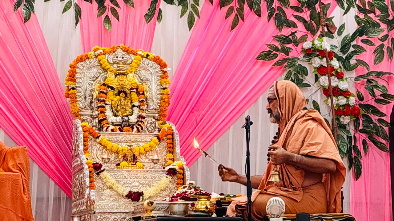 On the night of 16th December 2025, the air at Sāraswat Bhavan was charged with joy, devotion, and anticipation as devotees awaited the divine darshana of H.H. Shrīmat Sadyojāt Shaṅkarāshram Swāmījī. Ladies adorned in elegant sārī-s stood gracefully holding Pūrṇa Kumbha-s, their faces glowing with reverence.