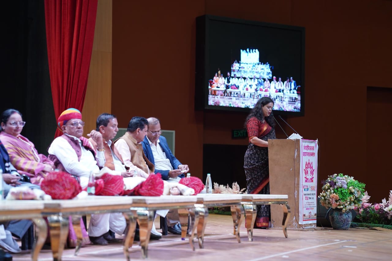 In the evening, the International Sāraswat Brāhmin Mahāsammelana (ISBM) 2025 commenced at the Mārwār International Centre, Jodhpur. The inauguration featured Dīpa Prajwālana, Gaṇesha Vandanā, welcome addresses and felicitations. The women volunteers coordinating sāfā, shrīphal and mementos were impeccably dressed and managed the proceedings with grace.