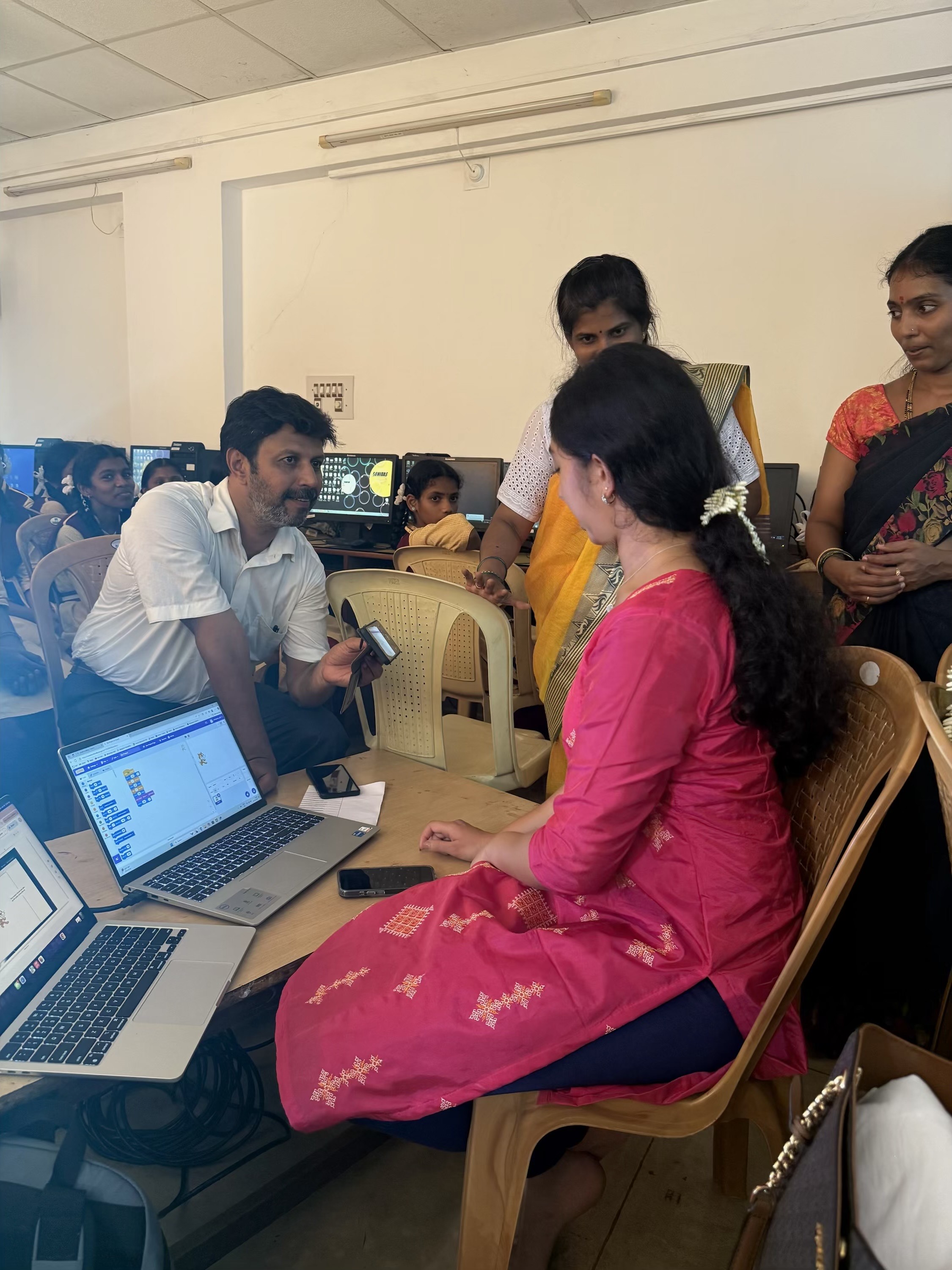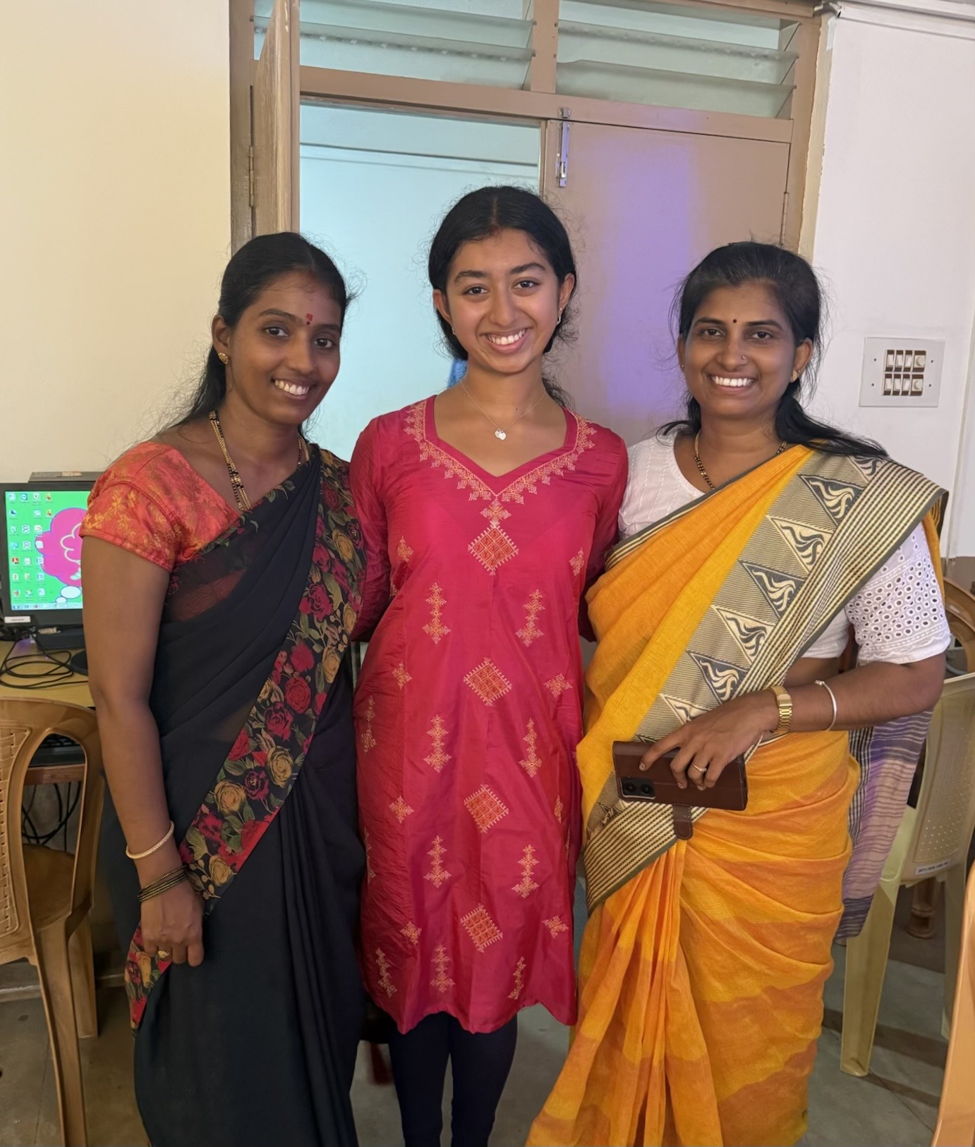 I was taking Prarthana classes at a young age, and eventually moved into Prerana classes which I am taking now. On most of our trips to India, my parents have taken me to meet Swamiji and receive His blessings, too. When I went to meet Pujya Swamiji, He was very happy to hear about my plan on conducting a robotics workshop for the students in Shirali. He gave me many tips and provided me with a lot of support and people to guide me. Swamiji encouraged me to pursue similar volunteer work in other schools within the area, as well, which I was very excited about.