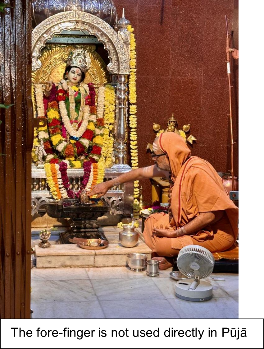 Each finger has certain attributes of the pañcha tattva or pañcha mahābhūta-s (the five elements constituting the whole of creation - Earth, Water, Fire, Air and Space. It has not been elaborated here, for simplicity). Different parts of the hand are used for specific ritual actions, with specific significance. The right-hand ring-finger is used to offer gandha to the Deity and for drawing symbols during pūjā-s. The fore-finger is usually not used in mudrā-s for pūjā.