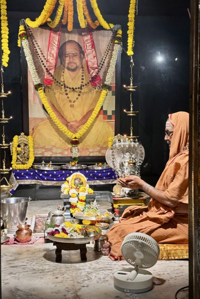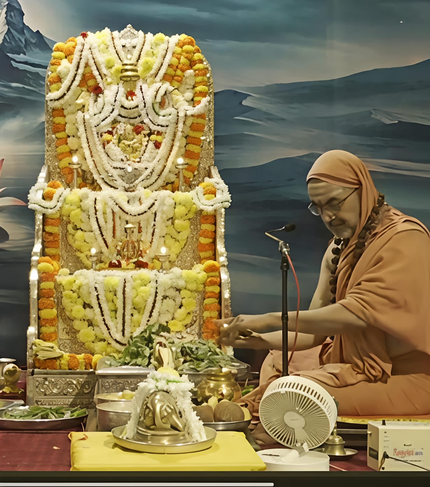 H.H. Swāmījī offering Naivedyaduring Pūjā with Dhenu Mudrā