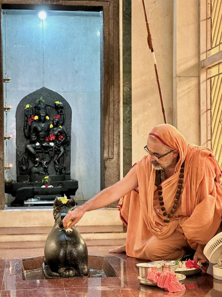 H.H. Swāmījī offering Pūjā and flowers to Nandīwith Mṛga Mudrā (at
