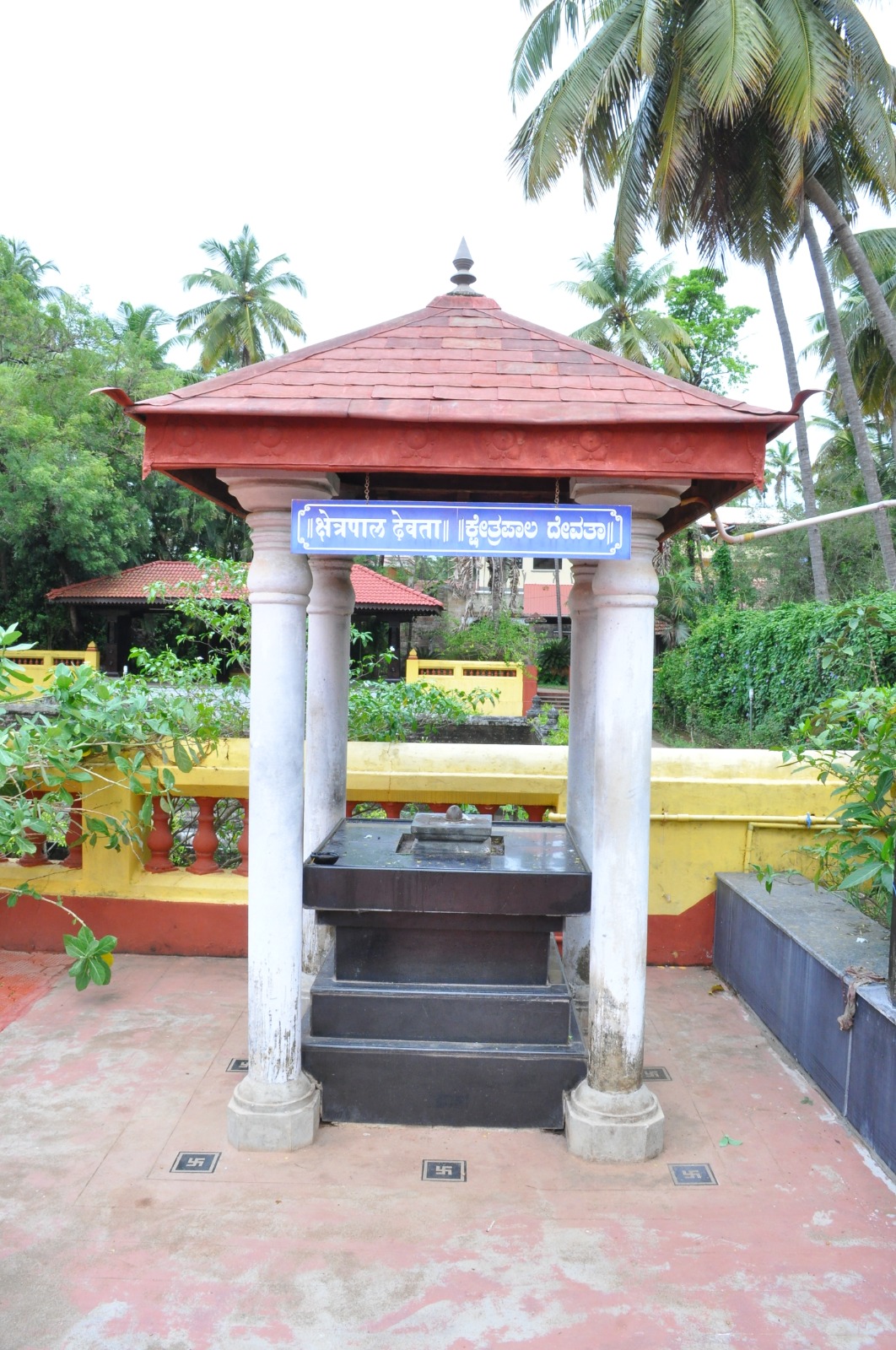 Illustration for Dhūl̃abheṭa sequence within Shrī Chitrāpur Mat͟h, ShirāliThe imposing Dhwajastambha, which is splendorous with decorations and the “Dhwaja” during the annual Rathotsava, has Rāmāñjaneya consecrated at its base, reminding us of the steadfastness of faith as we pay our respects here. Next, one offers namaskāra to the Tulasī at the Tulasī kaṭṭŏ next to the Dhwajastambha, which inspires us to offer unequivocal sevā.
