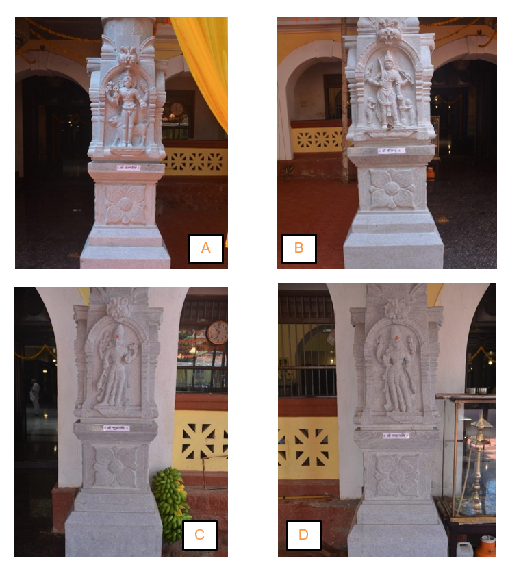 As we enter the main Pravesha Dwāra of the Mat͟h, we pass the four newly erected stambha-s (pillars) of the portico with the Raudra Gaṇa-s of Shiva, guarding and protecting the sacred Vāstu of our Mat͟͟h. (Please refer to the illustration) We pay our respects first to Shrī Kālabhairava (A) and Shrī Vīrabhadra (B), associated with Shiva’s intense energy and power.