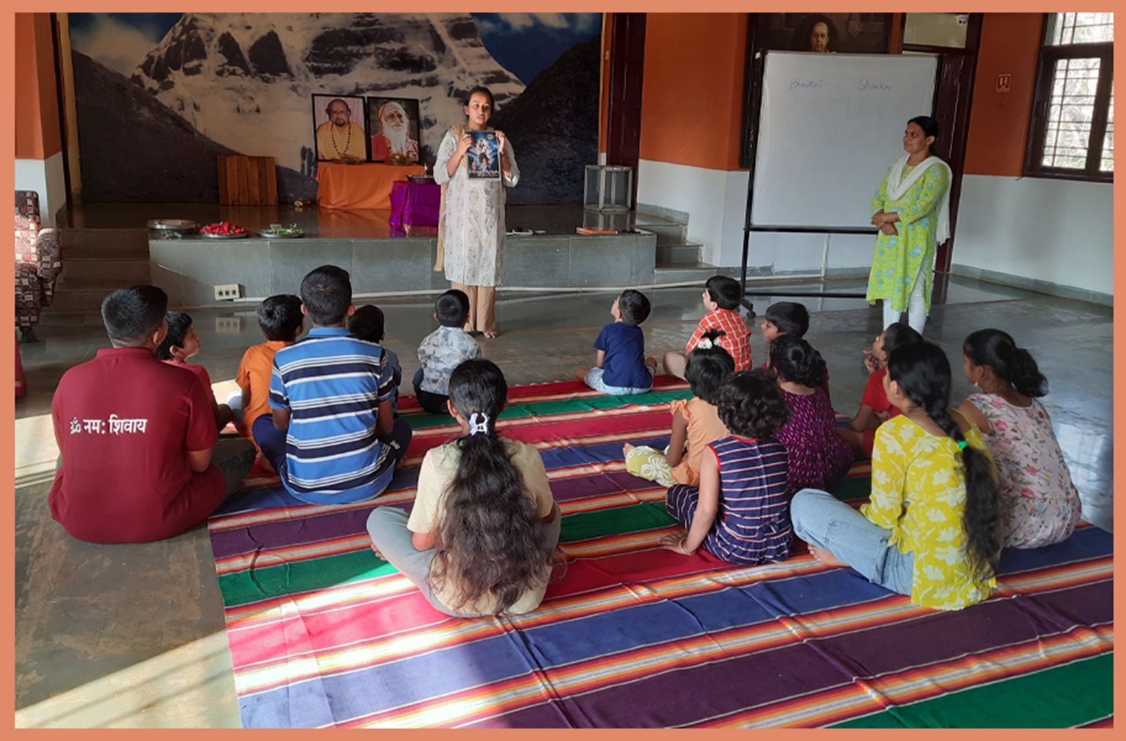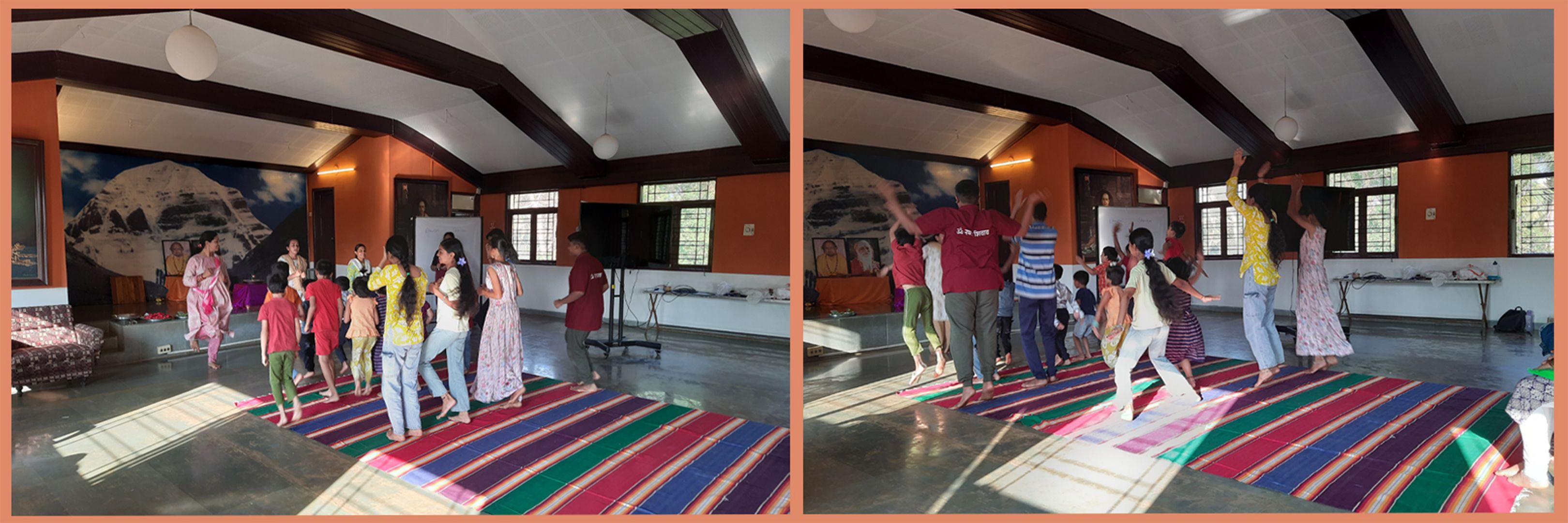 An ice-breaker game followed, where the children identified the symbols of Devī Bhavānī and Bhagawān Shaṅkar to form two lively teams. The activity immediately sparked excitement and participation among the young attendees.