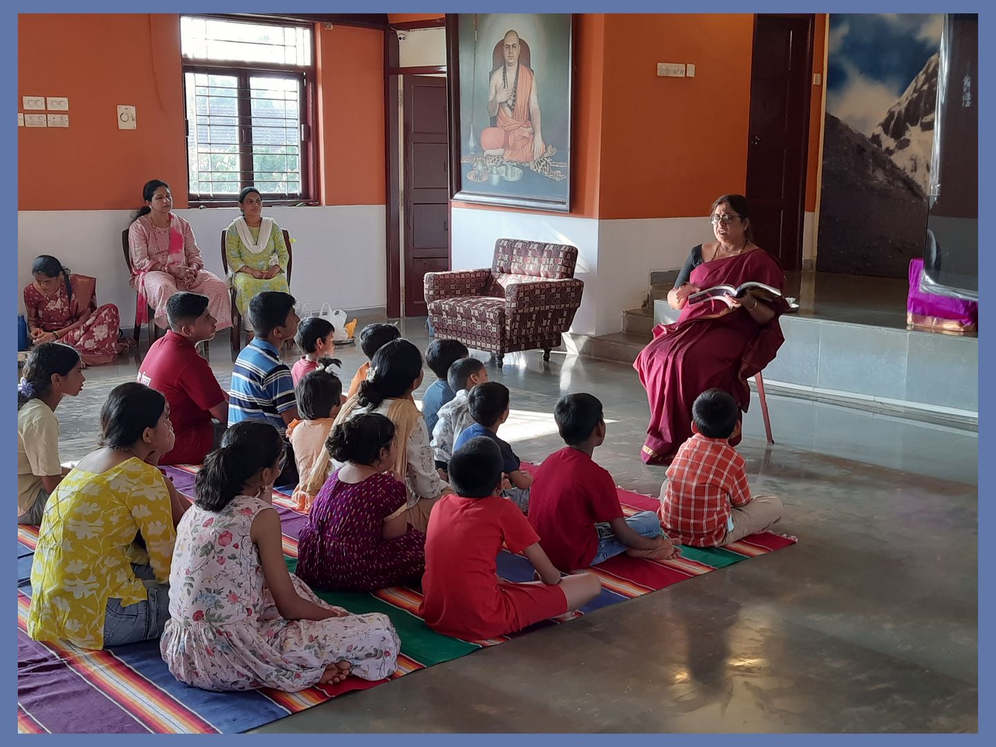 Continuing the interactive learning, the children were asked to recall the Devī Bhuvaneshwarī Vardhantī celebration that had taken place at the Mat͟h in the previous week. Building on this, Beenā Savkūr pāchī narrated the story of Devī Bhuvaneshwarī from the book ‘Utsava’, accompanied by a Koṅkaṇī translation so the children could better understand and relate to the narrative.