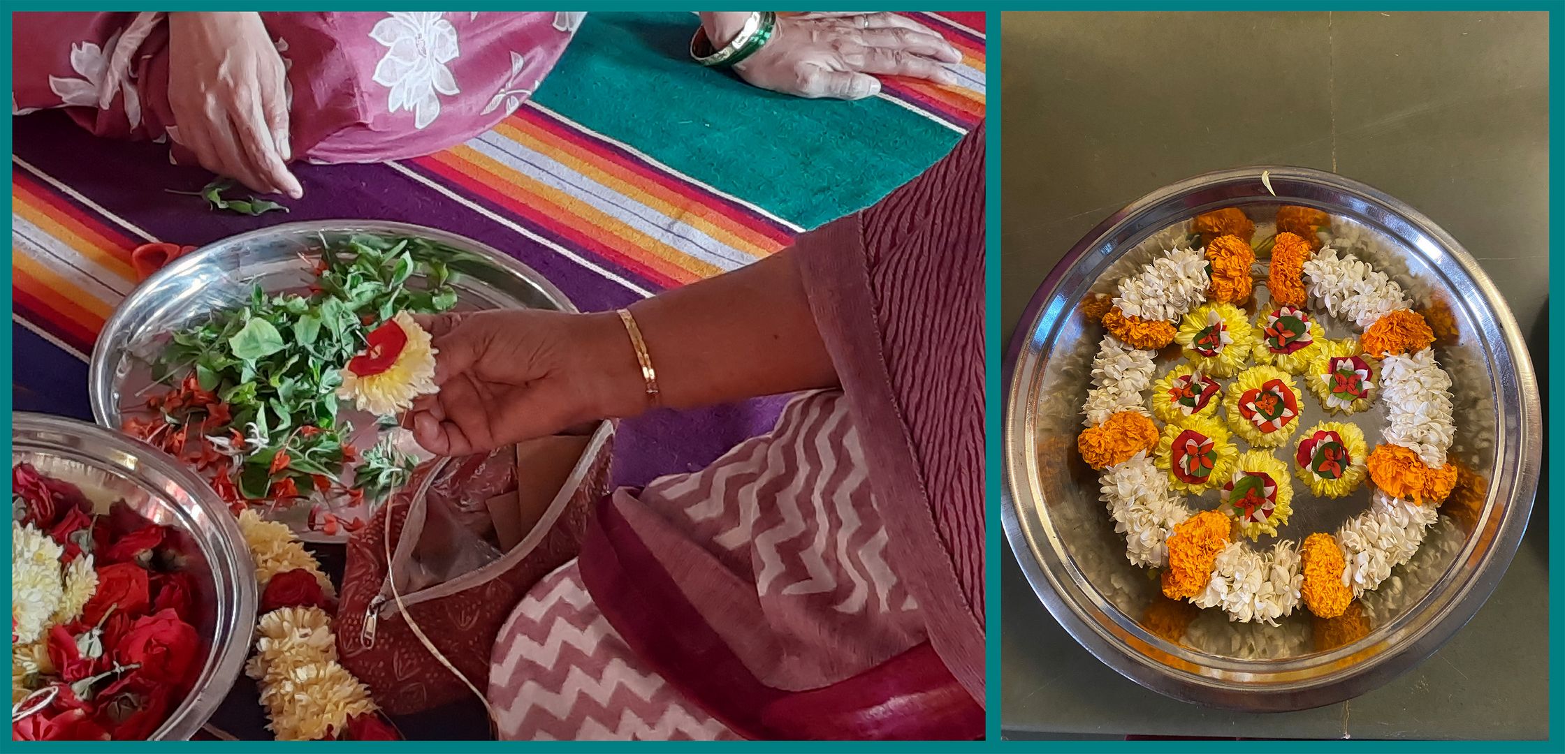 The senior children learned two techniques of phūla gāntchĕ (garland making) from Chitrā Shiroor pāchī. She also introduced them to the As͟hṭa Pus͟hpa offered during Shrī Shiva Pūjana.