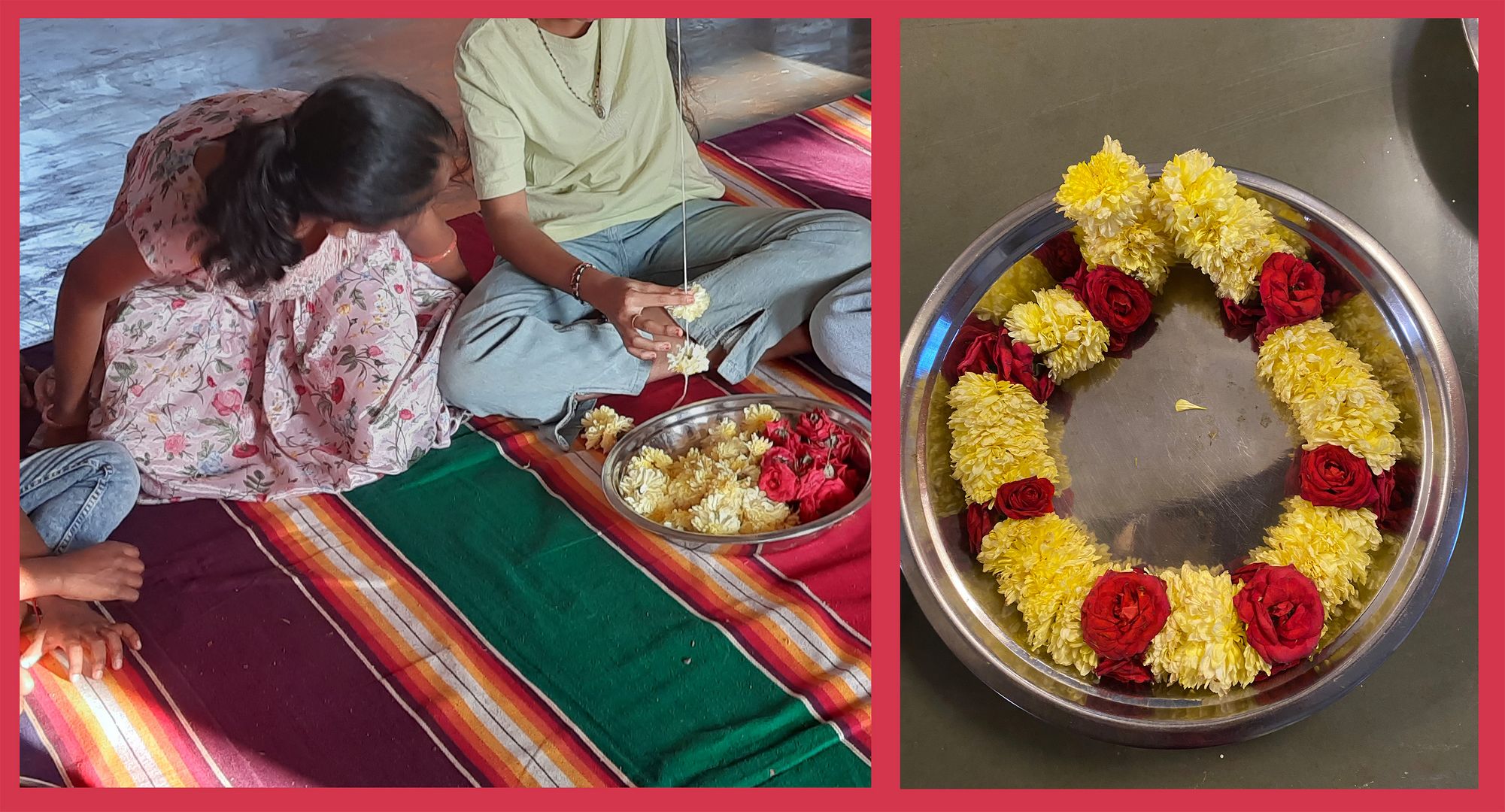 The children were guided on how to select evenly sized flowers and handle them delicately while weaving them into a garland, using thread and needle.